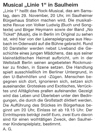 Musical "Linie 1" in Saulheim (Wörrstädter Nachrichtenblatt vom 27.11.2003)