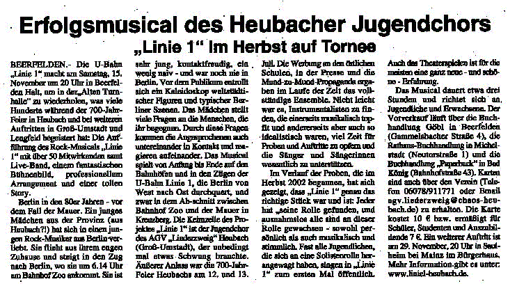 Erfolgs-Musical des Heubacher Jugendchors (Oberzent Aktuell 31.10.+7.11.2003)