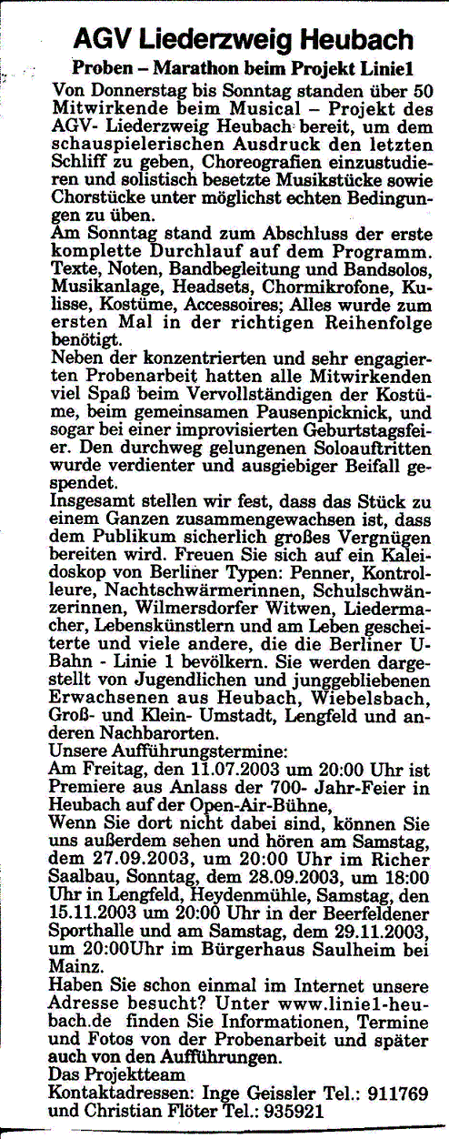 Proben-Marathon beim Projekt Linie 1 (Odenwälder Bote vom 24.6.2003)